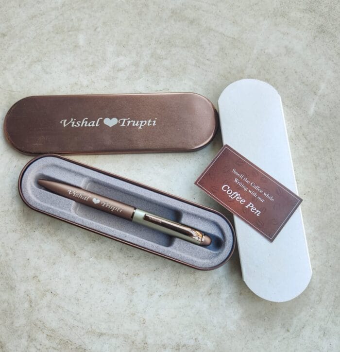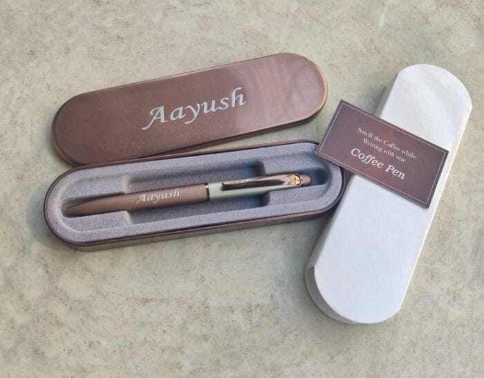 The Fairus Coffee Fragrance Pen offers a delightful way to enjoy the aroma of coffee anytime, anywhere. With customizable options, you can have your name elegantly written on both the pen and the sleek metal box, making it a perfect gift or personal indulgence for coffee lovers. Specially designed to give users a sensory experience with the aroma of coffee beans while writing. Coffee Scented Ink – Smell the coffee while writing with our Coffee Pen