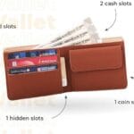 Features: Despite its sleek design, this slim wallet offers ample storage space. It features multiple card slots, a spacious bill compartment, and a convenient ID window,
